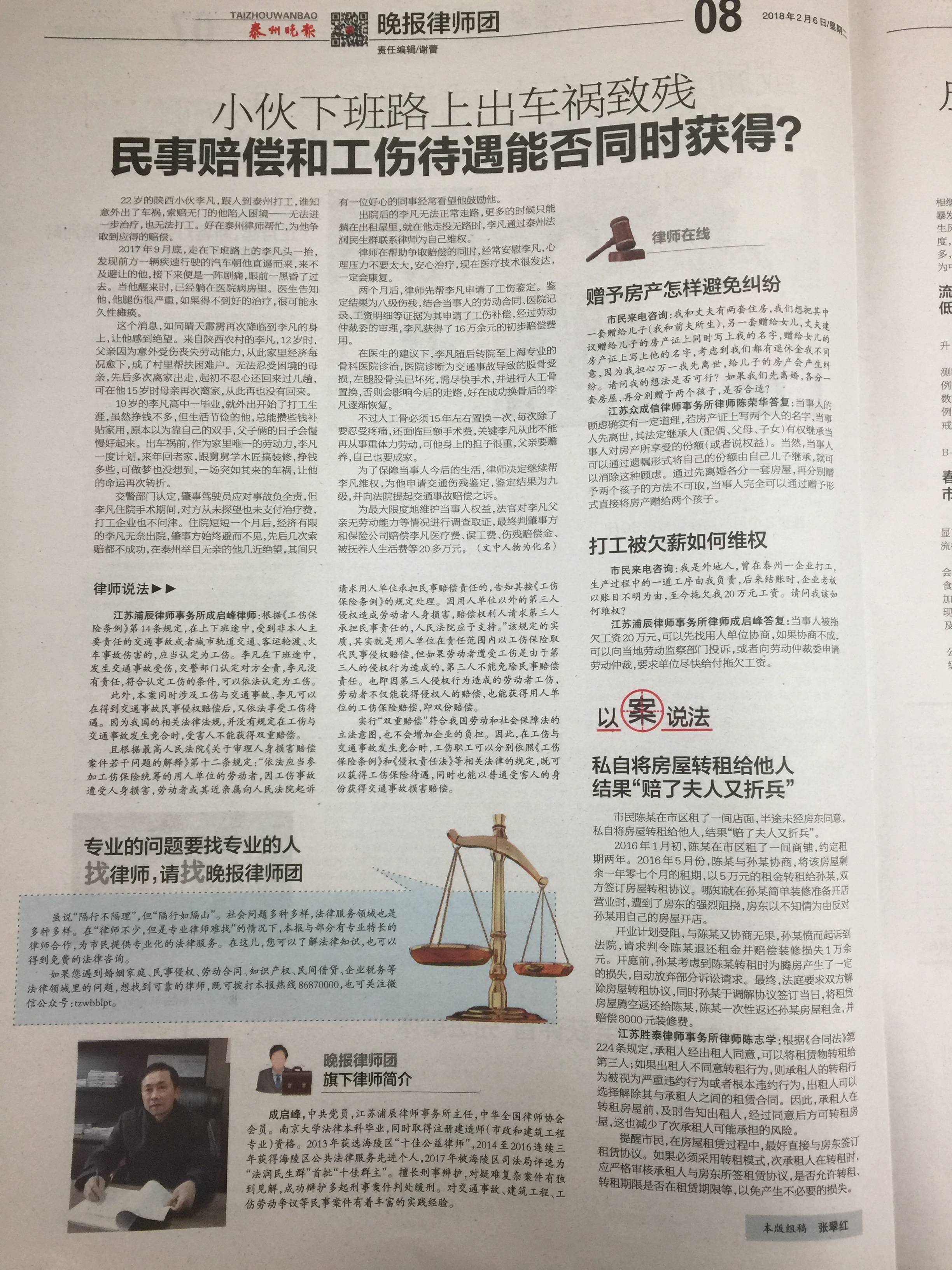 2017年3月,海陵区工人沈一山施工时不慎从高处摔